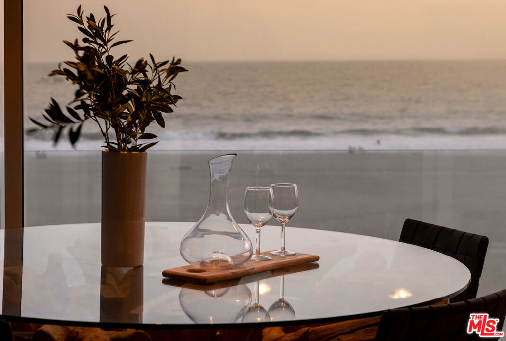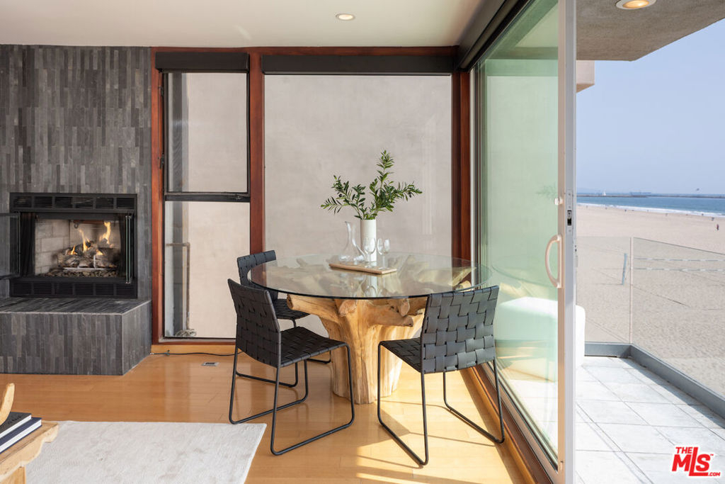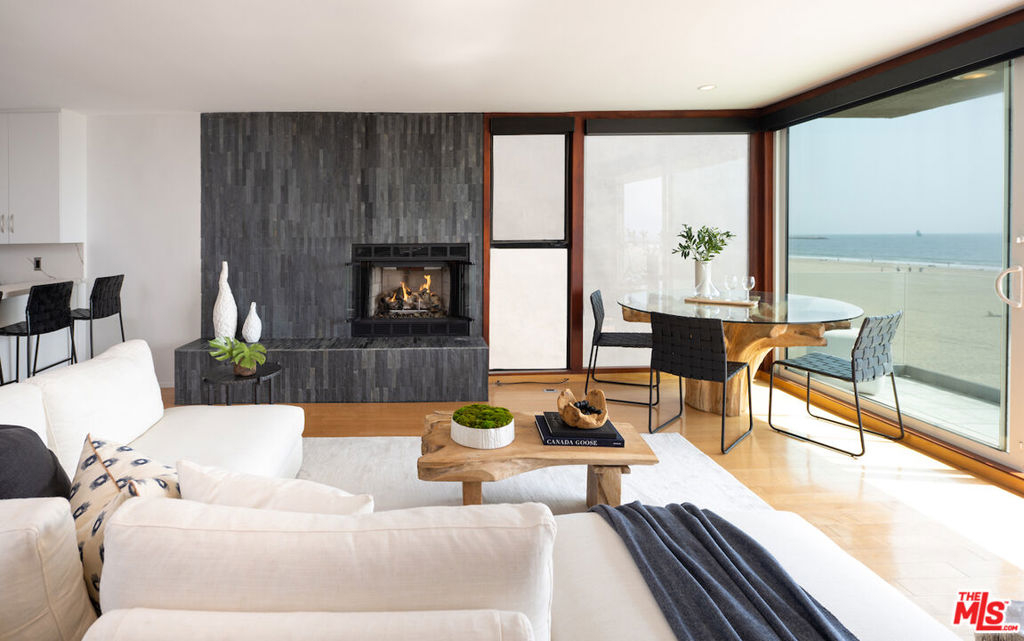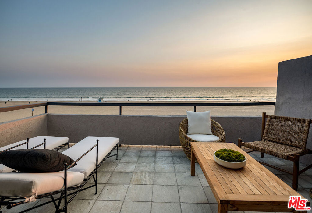 On the sand, this 1,620 SF oceanfront penthouse delivers uninterrupted views of the ocean and beach just below. Sourced from western-facing windows, this private pied--terre on the Marina Peninsula is bathed in light all day and provides front-row seats to captivating sunsets from both levels. Ideal for entertaining, the main level features an open concept living/dining area with a fireplace, which seamlessly connects to a kitchen adorned with custom cabinetry, Caesarstone countertops, and stainless appliances. Also on the main level are two generously sized bedrooms, one of which easily functioning as a home office or gym, the other, a junior suite with spa tub. Above, is the very private primary suite, equipped with an oversized shower for two, walk-in closet, and a large oceanfront terrace. Other amenities include hardwood floors, lower HOA dues, and two covered parking spaces. Square footage includes 165 SF upper terrace.