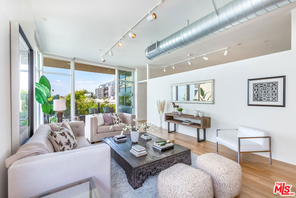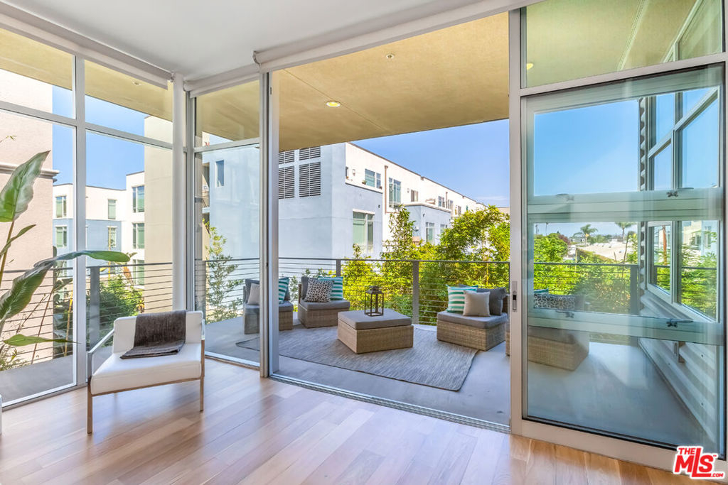 Modern, industrial style loft at the Gallery Lofts, one of the top selling loft communities in the area. Indoor/outdoor living with a sophisticated, architectural feel - the perfect place for you to live, work from home and relax. Soaring 11 foot ceilings and beautiful hardwood floors throughout. Large windows invite in lots of natural sunlight with remote controlled shades. Sleek, floor to ceiling, Fleetwood sliding glass doors open directly to a private, wrap-around patio, on a corner, that looks out to greenery and extends the living space allowing plenty of room for entertaining, outdoor dining, lounging and exercising. The kitchen features European stainless steel appliances, a kitchen island with seating and extra counter space. Large built-ins closet good for storage, adjacent to kitchen. The primary bedroom has a walk-in closet, tiled master bath, an oversized soaking tub and separate glass shower. The bright, 2nd bedroom &/or office connects to a full bathroom. The entire home has been freshly painted in detail. Washer & dryer in the unit. This special loft was deeded with a separate storage unit in the garage, and is located in the back of the building, away from the street. Community is gated, it features a spacious courtyard, double-sided fireplace, lounge seating, 2 outdoor BBQ's & an outdoor dining area with lush landscaping. Easy walk to the Marina Marketplace, shopping & restaurants. About two miles to the beach & located close to the 90 freeway for quick access to all that LA's westside has to offer. This beautiful loft is not to be missed.