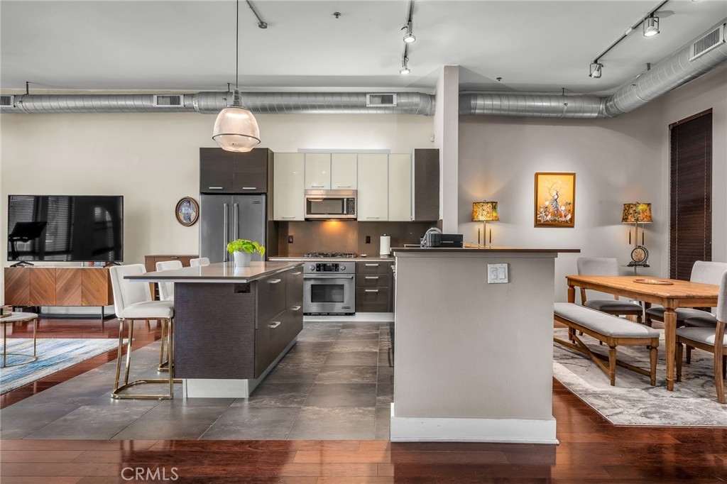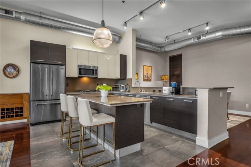 Welcome to the ultimate Marina lifestyle in the highly sought-after Marina Arts District, just moments from the energy of Marina del Rey and the iconic Abbot Kinney Boulevard. Located in the stylishly designed Steel Lofts building, this industrial-chic residence blends modern luxury with dramatic architectural detail. Soaring ceilings, exposed ductwork, and a sun-drenched open-concept floor plan create an impressive yet inviting living space, enhanced by sleek dark hardwood floors and floor-to-ceiling windows. The chef’s kitchen is both functional and striking, featuring a large center island, JennAir stainless steel appliances, and elegant Caesarstone countertops—perfect for entertaining or everyday living. Two beautifully appointed bathrooms elevate the experience: the primary suite showcases a sliding barn door leading to an oversized shower with dual shower heads and a built-in bench, while the second bathroom offers a deep soaking tub for ultimate relaxation. The versatile dining room can be enclosed and used as a second bedroom or private office, ideal for today’s flexible lifestyle. Step outside to a spacious balcony—perfect for morning coffee or evening unwinding. Additional highlights include central A/C, in-unit washer and dryer, two-car tandem parking with unit-designated EV charger, and guest parking within a gated, controlled-access garage. Just minutes from top restaurants, coffee shops, boutiques, the Marina, and the beach, this home offers the perfect balance of style, space, and location for the ultimate urban coastal lifestyle.