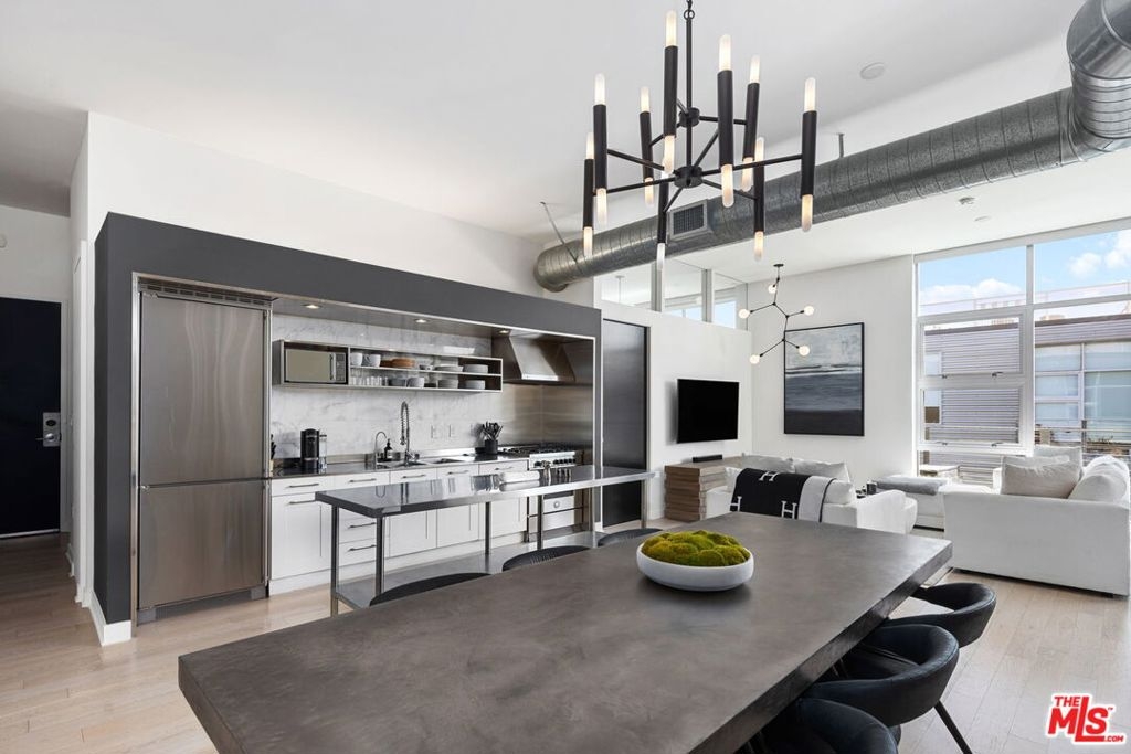 Hip, eclectic and endlessly strollable, welcome to the heart of the Marina Del Rey Arts District. Situated on the penthouse level of the coveted Gallery Lofts community is this rare south-facing end unit that has been thoughtfully reimagined into the ideal city retreat. The New York loft-style residence has industrial details, sophisticated finishes, and an open floor plan set beneath 11ft high ceilings with floor-to-ceiling windows for abundant natural light. The thoughtful layout provides effortless flow between the gourmet kitchen, dining area anchored by a built-in, sunny living room, and a den that makes an ideal home office. The kitchen is the jewel of the home with sleek stainless steel finishes, premium appliances, and chic marble tile backsplash. Another standout feature is the expansive, covered patio, one of the largest in the building. Here find ample space for entertaining, dining alfresco, or simply enjoying Marina Del Rey's ocean-kissed breezes. The home offers two en suite bedrooms on either side of the floor plan for privacy and serene living. The primary suite connects to a luxurious bathroom with custom tile details, a deep soaking tub, and glass-enclosed shower. While the en suite bathroom for the second bedroom also opens up to the living area, a convenient feature for guests. Other notable features include in-unit stacked laundry area, a new AC system, tandem parking for two vehicles with an EV charger, and private storage space. The Gallery Lofts community offers indulgent resident amenities like the lush common area with WiFi, two BBQ areas, and a lounge, set around a two-sided fireplace. Security is a top priority in this gated complex with controlled access entry, cameras, and secure subterranean garage parking with space for guests. Supremely located near work hubs, the restaurants and boutiques of Abbott Kinney and Main Street, and outdoor activities including the marina, beaches, and the coastal bike path. Welcome to the intersection of surf and scene, where you will find a distinctly unique living experience with the best of LA's westside at your doorstep.