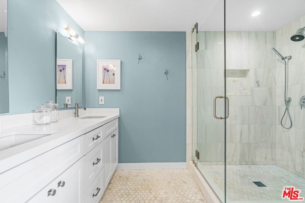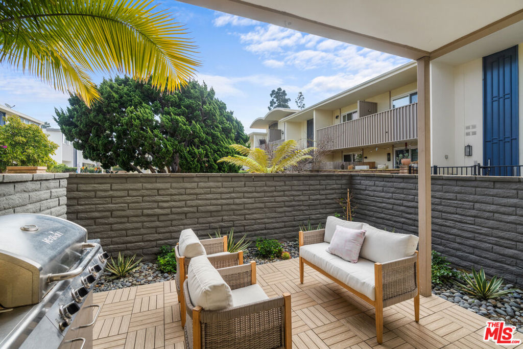 Indulge in sophisticated living with this rare, light-filled 3-bedroom end-unit featuring a spacious open-concept design, custom-upgraded interiors, and serene pool views from multiple private patios. Enter from the ground level to a contemporary living environment defined by soaring ceilings, engineered hardwood floors, and abundant natural light. The generously sized living area flows effortlessly to an enclosed, private deck, an ideal extension for outdoor dining or relaxation. The remodeled gourmet kitchen anchors the social core of the home, featuring custom cabinetry, a central island, marble countertops, and premium Bosch and built-in appliances. Upstairs, the three bedrooms, each filled with sunlight, include a luxurious primary suite with its own private patio, expansive custom closets, and a spa-like en-suite bathroom with double vanities and tile finishes. Thoughtful enhancements throughout include new custom doors and railings, Hunter Douglas automated shades, a modern gas fireplace with custom child-lock screen, NEST-controlled central HVAC, and a Ring security system. Everyday function is elevated by a dedicated laundry room, direct-entry private two-car garage with epoxy flooring, Tesla electric vehicle charging, and a generous bonus storage room. Enjoy tranquil pool vistas from multiple rooms and direct access to association amenities, including an in-ground heated pool, manicured grounds, and controlled entry. HOA fees include water, building and grounds maintenance, and nearly round-the-clock private security. Moments from renowned Marina Del Rey dining and shopping options, this turnkey, updated residence fuses comfort, style, and convenience in a coveted Silicon Beach location.