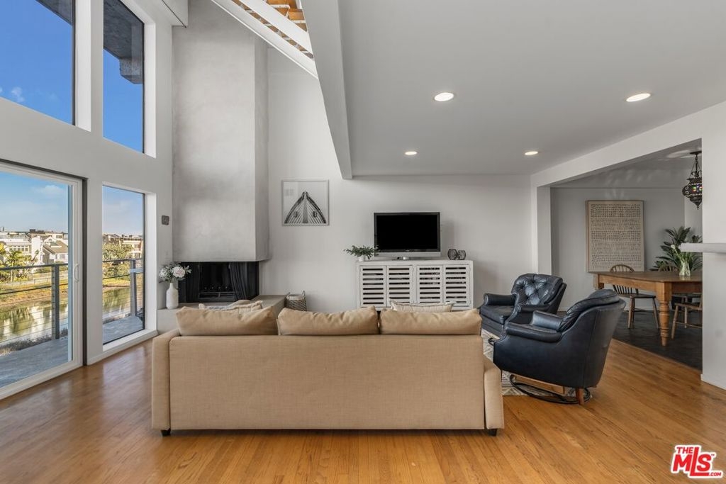 Located on the prestigious Marina del Rey Peninsula, this stunning townhouse boasts panoramic canal views from all 3 levels and is steps to the most gorgeous beach in LA! 3 Bedrooms + 3.5 Bathrooms + 3 exquisite balconies, soaring ceilings with an open floor plan. The living room is dramatic with a wall of glass framing the canal views, 2 + story vaulted ceilings, decorative fireplace, hardwood floors, open to the dining and kitchen which was renovated with white cabinets and cement countertops. Private lofty primary suite with its own over sized outdoor balcony, walk-in closet, en-suite bath features a spacious walk in shower and dual vanity. Roof level deck access with tremendous views. On the first level there are two large bedrooms + 2 bathrooms + laundry with stone floors and ample closet space. Two car side by side parking + storage in a private community garage. The building also offers 6 guest parking spaces shared. Walking distance to many shops, restaurants, Abbott Kinney, the canals, beach and all the area has to offer.