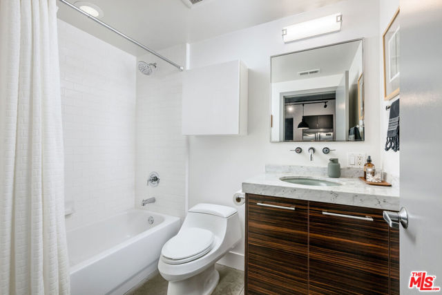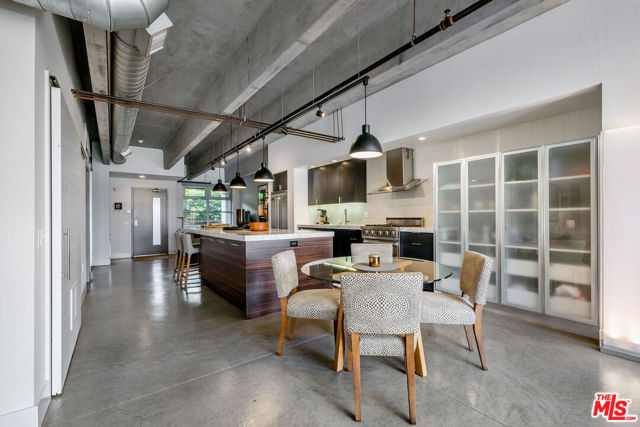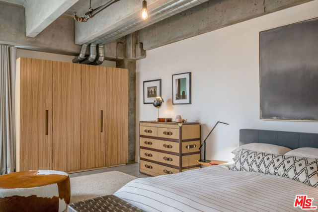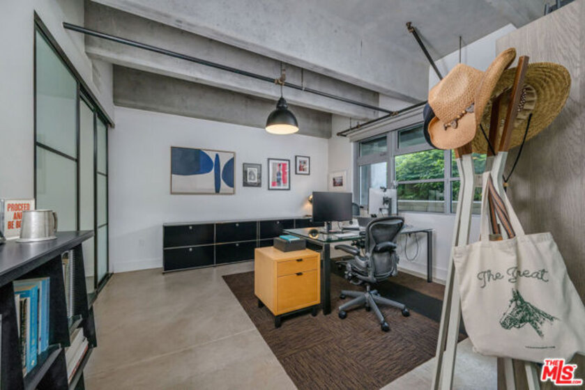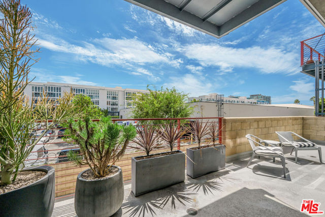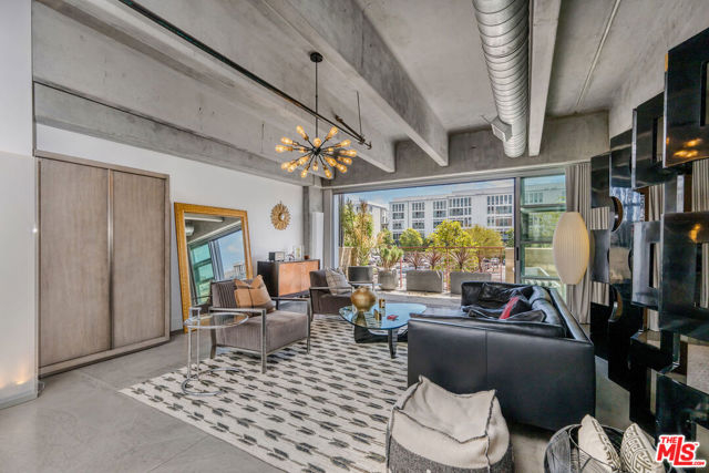 Experience true loft living in this one-of-a-kind residence at Element, a design-forward building featured in The New York Times and L.A. Architect Magazine for its distinctive concrete and steel construction, 11-foot ceilings, and exposed concrete beams. This industrial-style space is softened by designer finishes, offering a refined, creative living environment. This expansive, south-facing 1,540 SF unit features polished concrete floors, updated lighting, custom zebra wood cabinetry and closets, ripple fold drapery, and motorized light-filtering shades. Floor-to-ceiling aluminum-framed windows and Fleetwood sliding glass doors lead to a double-width private balcony, seamlessly blending indoor and outdoor living. The oversized 13' Carrara marble island with soft-close drawers, bar seating, built-in pantry, Viking Professional appliances, Brizo faucet, double-bowl sink, and wine fridge anchor the chef's kitchen, ideal for entertaining. The spa-like bath includes a double vanity, soaking tub, walk-in shower with dual shower heads, and custom linen cabinet. Note: This unit does not have enclosed bedrooms, offering a fully open floor plan perfect for creative customization. Additional Features: *Two parking spaces (tandem) with EV charger *Ample guest parking *Secure access, fitness center, bike storage *Community courtyard with fire pit and grill *Well-managed building with strong reserves. Located in the heart of the Marina Arts District with a Location Score of 92, just minutes from shops, restaurants, theaters, the beach, and marina. Don't miss this rare opportunity to live in one of the Westside's most architecturally distinctive and vibrant communities.