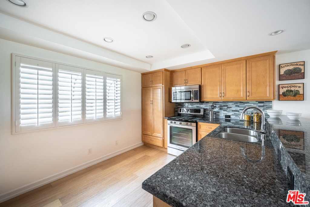 Filled with designer appeal, 4715 La Villa Marina, Unit D, is a Silicon Beach coveted end-unit townhouse. Overlooking the pool and courtyard, this Villa Rapallo split-level floor plan presents upgrades throughout. The remodeled kitchen is a chefs delight opening out to the expansive view of dining and living rooms as well as the adjacent enclosed patio. Above the sliding doors leading to the private outside space are artisan decorated window panes embracing seasonal skies. Boasting two master suites; one is enhanced by an enclosed balcony used perfectly as an exercise space enhanced by a row of double hung windows viewing the pool. The second bedroom suite benefits from handsome woodgrain-hued cabinets and shelving expertly framing a large shuttered window. This is truly a residential haven. For your daily pleasure, you will appreciate the convenience of an inside laundry closet and the security of the 2-car direct entry garage complete with a large storage area. This oasis benefits from the close proximity of shopping, restaurants, movie theaters, bike path, parks and transportation. The farmers market, community and coastal events add to the ambience of this beautiful Marina del Rey townhouse.